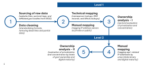 These data were gathered from the portal between May and June 2025, after which we conducted a nameserver lookup and a domain name server (DNS) mapping exercise for each of the websites. The IP address(es) acquired through these mappings were then processed through ‘WhoIs’ commands, which led us to access key details about the owner of the IP block to which these addresses belong. It is this final detail that gives us an insight into the service provider, private or public, hosting a particular website. The figure below provides an overview of our research methodology and the two levels of our analysis.
